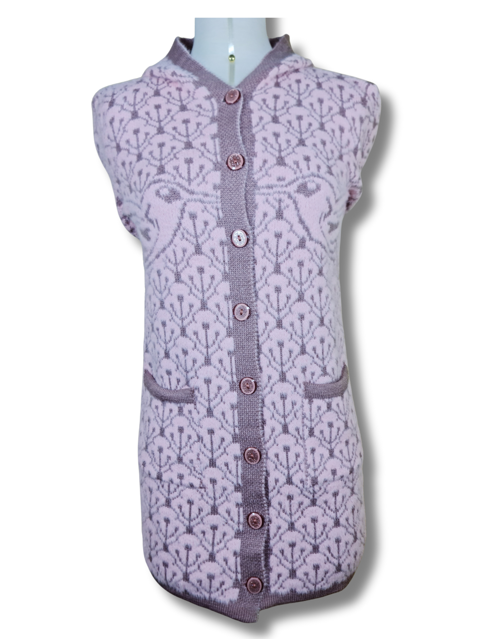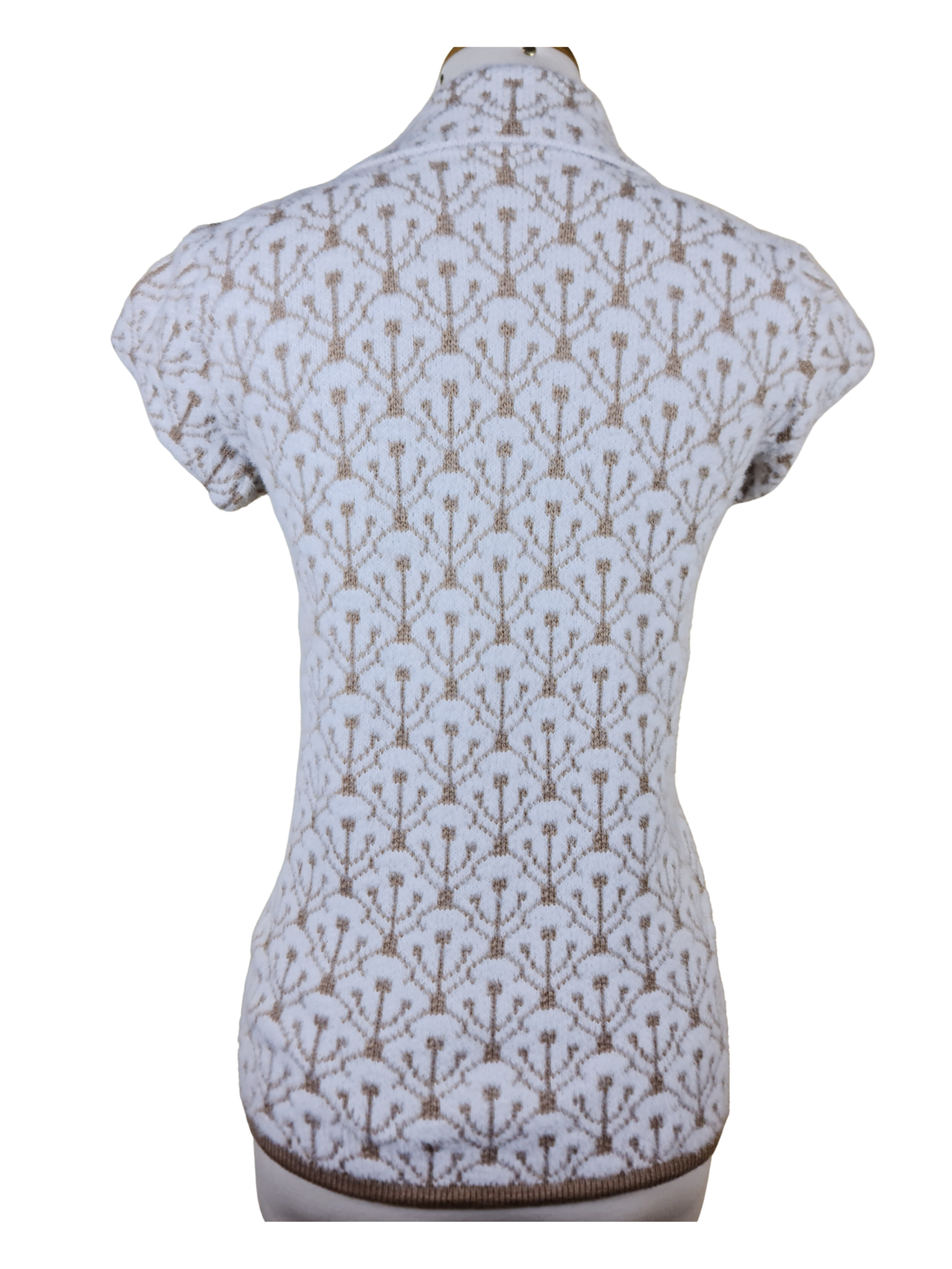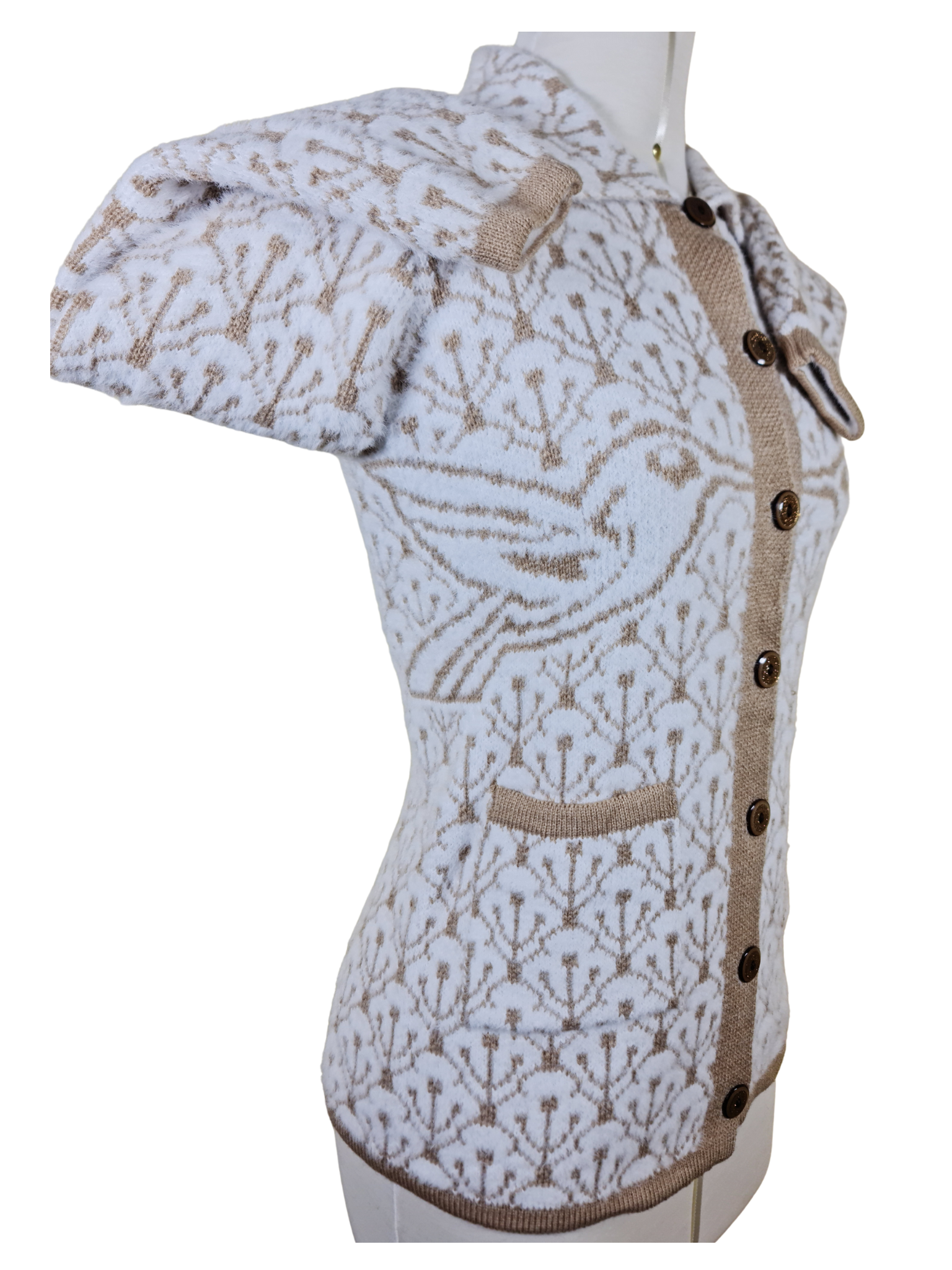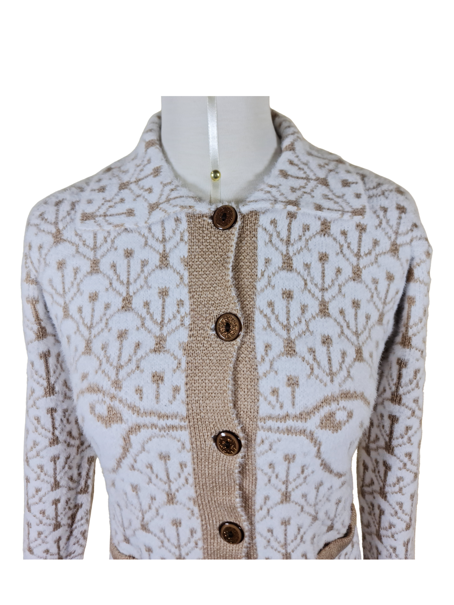 Presentamos este cárdigan de lana, perfecto para la temporada de frío. Destaca por su diseño tejido Jacquard , creando un patrón ornamental muy atractivo. Tiene un cuello de solapa elegante, cierre de botones en color a juego y bolsillos frontales. Es una prenda cómoda y versátil que añade un toque vintage y dulce a cualquier conjunto.
